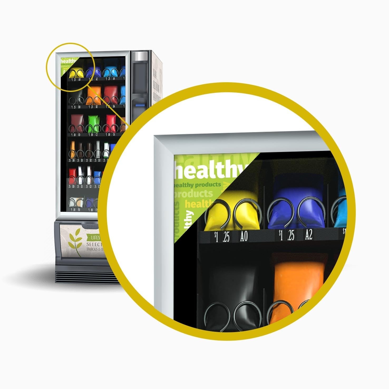 Con questi adesivi puoi indicare la presenza di prodotti salutari all'interno delle macchine per snack.